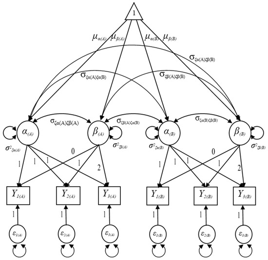 Let denote the observed outcome measure in domain A for the ith individual at time point t and represent the observed measure in domain B for the ith individual at time point t as seen in Figure 2. Given that the functional forms of the growth trajectories in both domain A and B are linear in Figure 2, the MDLGM can be expressed as follows:
