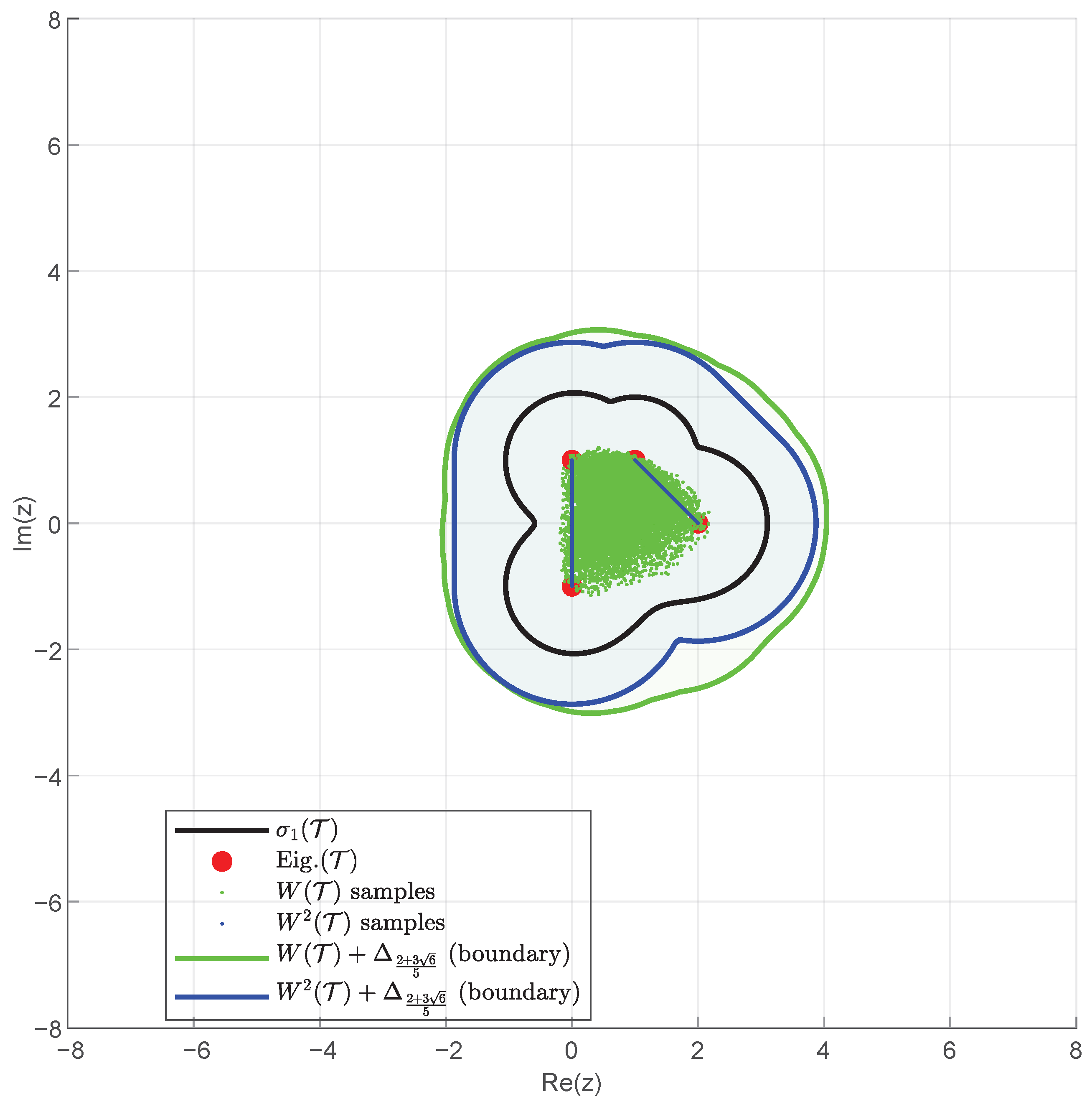Example 2. Consider the non-normal block matrix It is easy to see that andso that In the numerical experiments, we discretize the complex plane on a uniform grid and evaluate at each grid point λ. We approximate the ϵ-pseudospectrum by computing the contour . Moreover, for the matrix case, the computation of is given by [24]. Define . A direct calculation yieldsand consequently . In the case (ii) of Theorem 1, can be computed as: The numerical range is approximated via Monte Carlo sampling: we generate random unit vectors , compute the Rayleigh quotients and plot the resulting points in the complex plane where stands for the conjugate of x. To approximate the quadratic numerical range , we exploit the block structure of . Specifically, we draw random unit-vector pairs to form the corresponding compression matrices , and plot their eigenvalues. Finally, with , we depict the Minkowski sums and .