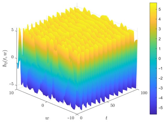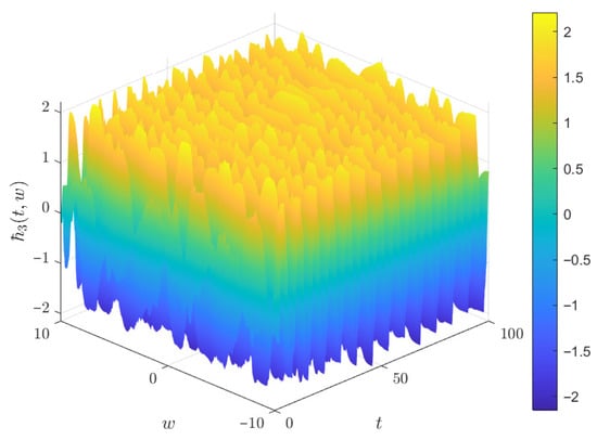 It is obvious that , , , , , , , , , , , , , , , , , , , , , , , , , , , , , , , , , , and . By choosing and , , , , , , then MATLAB 2020a simulations of system (39) corresponding to the initial conditions , and are given in Figure 2, Figure 3 and Figure 4, which verifies that system (40) possesses a chaotic attractor.