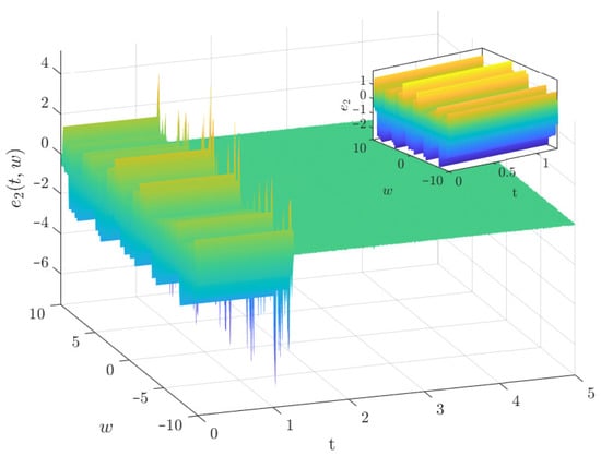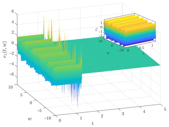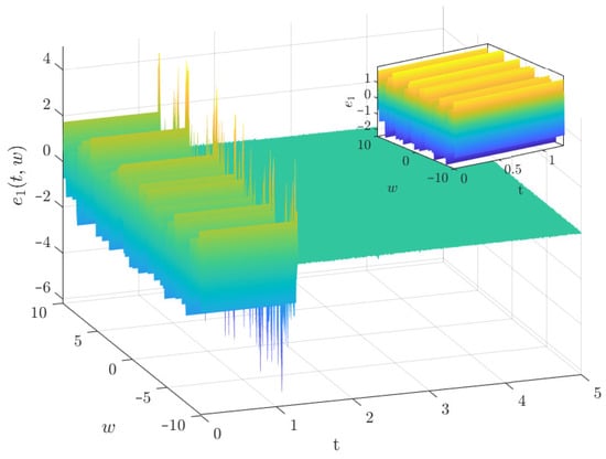 Next, we investigate the PDT synchronization between the drive–response systems (40) and (41) via controller (32). By choosing PDT , and setting , , , we can compute that , , , , . Therefore, from Theorem 2, we obtain that drive–response systems (39) and (40) achieve PDT synchronization in probability. Figure 9, Figure 10 and Figure 11 show the time evolutions synchronization errors between drive–response systems (39) and (40) under controller (32) with .