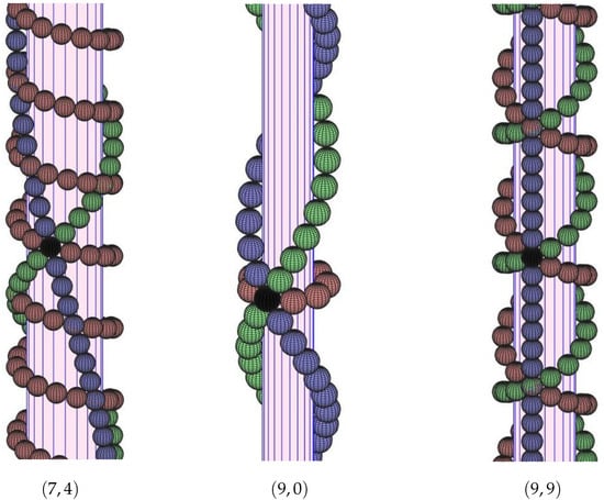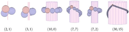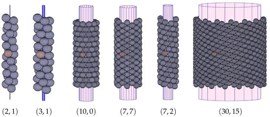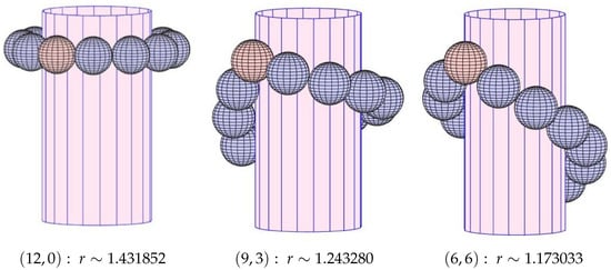 Spheres tangent to Cyl are also tangent to the inside of Cyl, and there has been research in the physics literature about the density of packing within cylinders. These questions arise in various natural and physical situations, such as cylinders containing cells, crystals, soft spheres, or foams. See [9,10,11] and works cited there. These studies often model systems using solid spheres, and their critical parameter is , the ratio of the diameter of the cylinder to that of the spheres. For less than roughly , simulations suggest that the densest packing will have all spheres tangent to the cylinder wall, while for larger values of there may be spheres interior to the cylinder. With our conventions, this cutoff converts to , and from Table 1 one can see that the -, -, -, -, and -hCSP’s fall within this setting. The work of physicists has been largely based on simulations, both physical and computer-based, as well as numerical approximations and analytic searches. Though this work consistently shows that nature prefers the hexagonal motif, purely mathematical claims about density remain open.