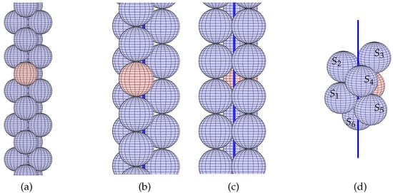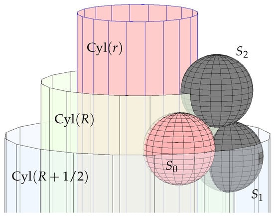When r takes its maximum value, the necklace is a horizontal choker, and would be identical, and . However, as suggested in Figure 7, as r decreases, and move apart, so increases. Indeed, if you visualize the necklace on progressively smaller cylinders, you will see it drooping until it eventually collapses—the pearls cannot remain tangent to the cylinder without beginning to overlap. At some point, the pearl before S and the pearl after S in the necklace will be tangent to one another, meaning and must be far apart and . As is clearly a continuous function, the intermediate value theorem ensures some radius r for which and and are tangent. For r, this necklace is called the -Goldilocks necklace. Once you have the -Goldilocks necklace, our earlier construction method lets you fill out the rest of an hCSP. Indeed, stacking translated and rotated copies of the necklace will give you the full packing on Cyl.
