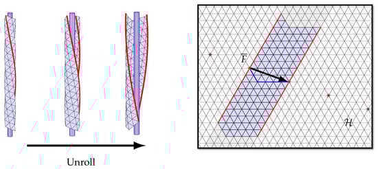 Figure 12 illustrates the situation for the -hCSP: • the lattice with edges for tangencies; • the shaded fundamental domain; • the spiral through in red; • the spiral through in green; • the spiral through in blue; • the covering map; • the projection to the mid cylinder Cyl. In this figure, one can see a concrete meaning for m and n: the full lattice is formed by parallel copies of the green spiral or copies of the red spiral. Though harder to see, it is formed as well by copies of the blue spiral. In biological studies of plant growth, 3-tuples are known as parastichy numbers and arise in the context of phyllotaxis, the growth of spiral patterns in plants, such as sunflowers, pine cones, or corn (See [12,13]). We will stick with our notation.