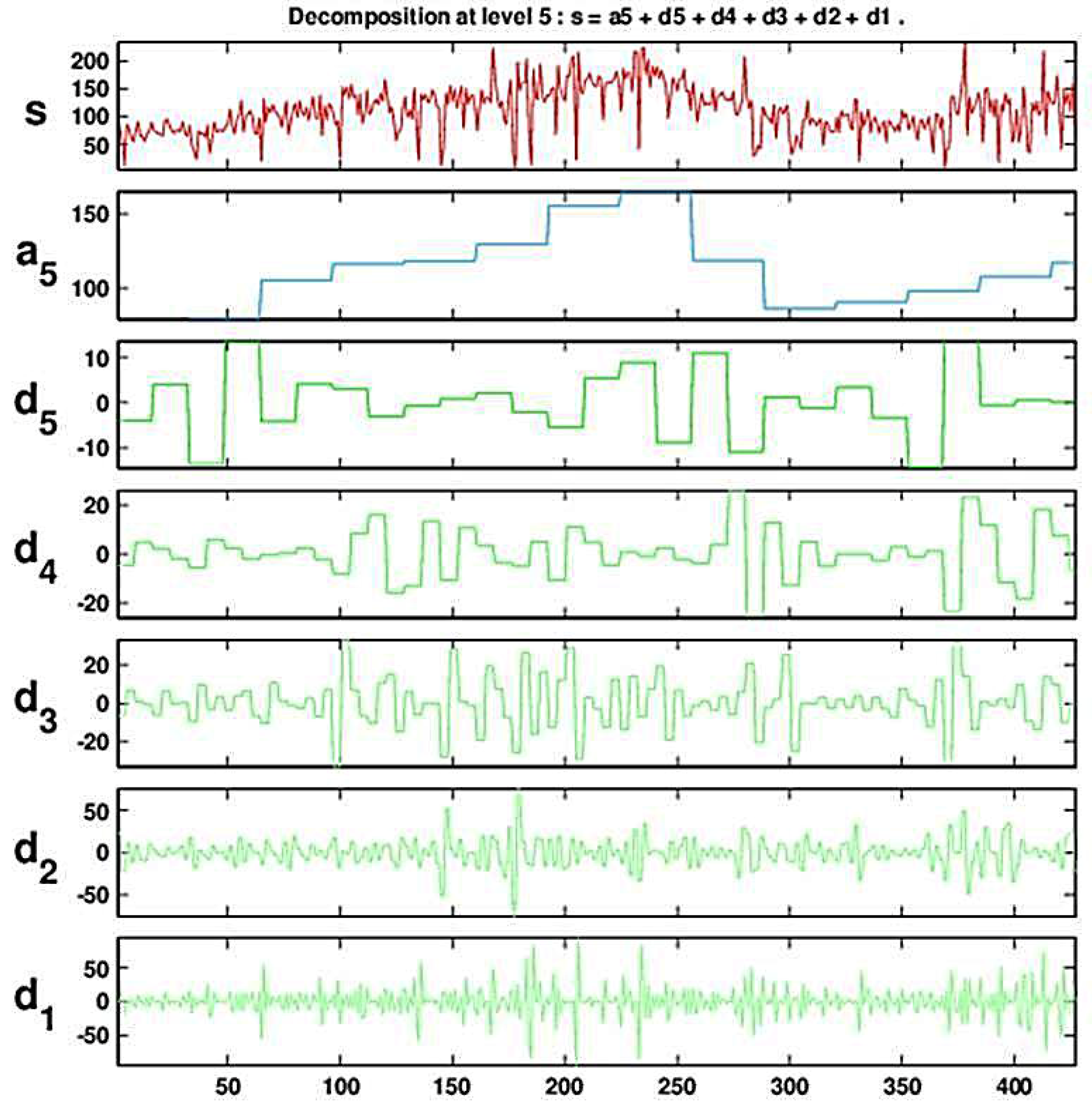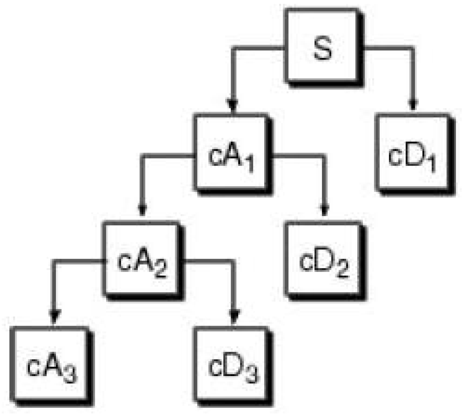 The process of discrete wavelet transform (DWT) (from Matlab’s Wavelet Toolbox Tutorial). The time-series (S) is decomposed into three scales.