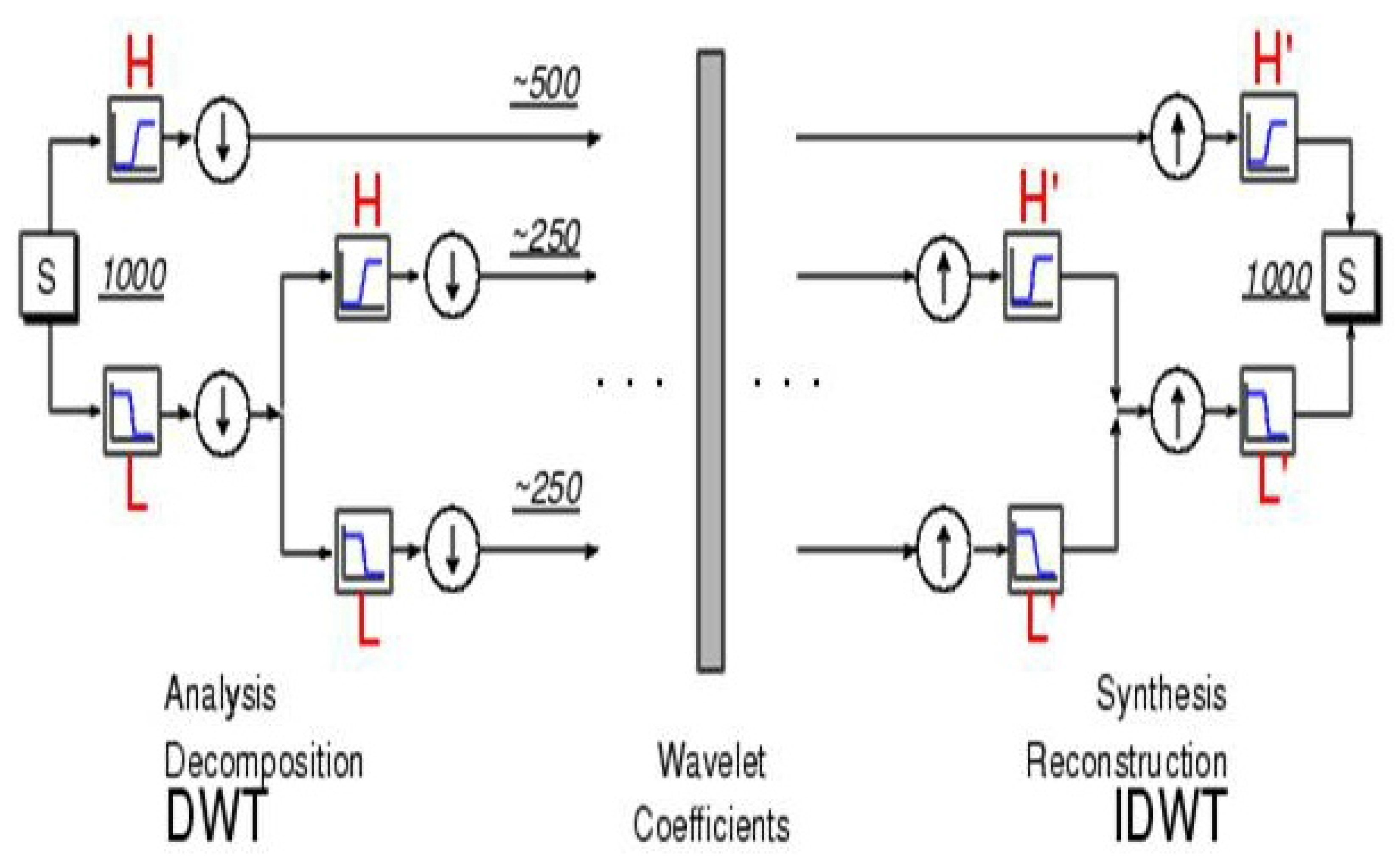 Decomposition (left) and reconstruction (right) of a signal to/from its coefficients. Decomposition is done by convolving the signal (S) of length with a high-pass filter (H) and low-pass filter (L) and then downsampling. The next scale is similarly obtained by convolving the first level approximation with these filters, etc. Reconstruction is achieved by upsampling and then convolving the upsampled vectors with “mirror filters”. (from Matlab’s Wavelet Toolbox Tutorial).
