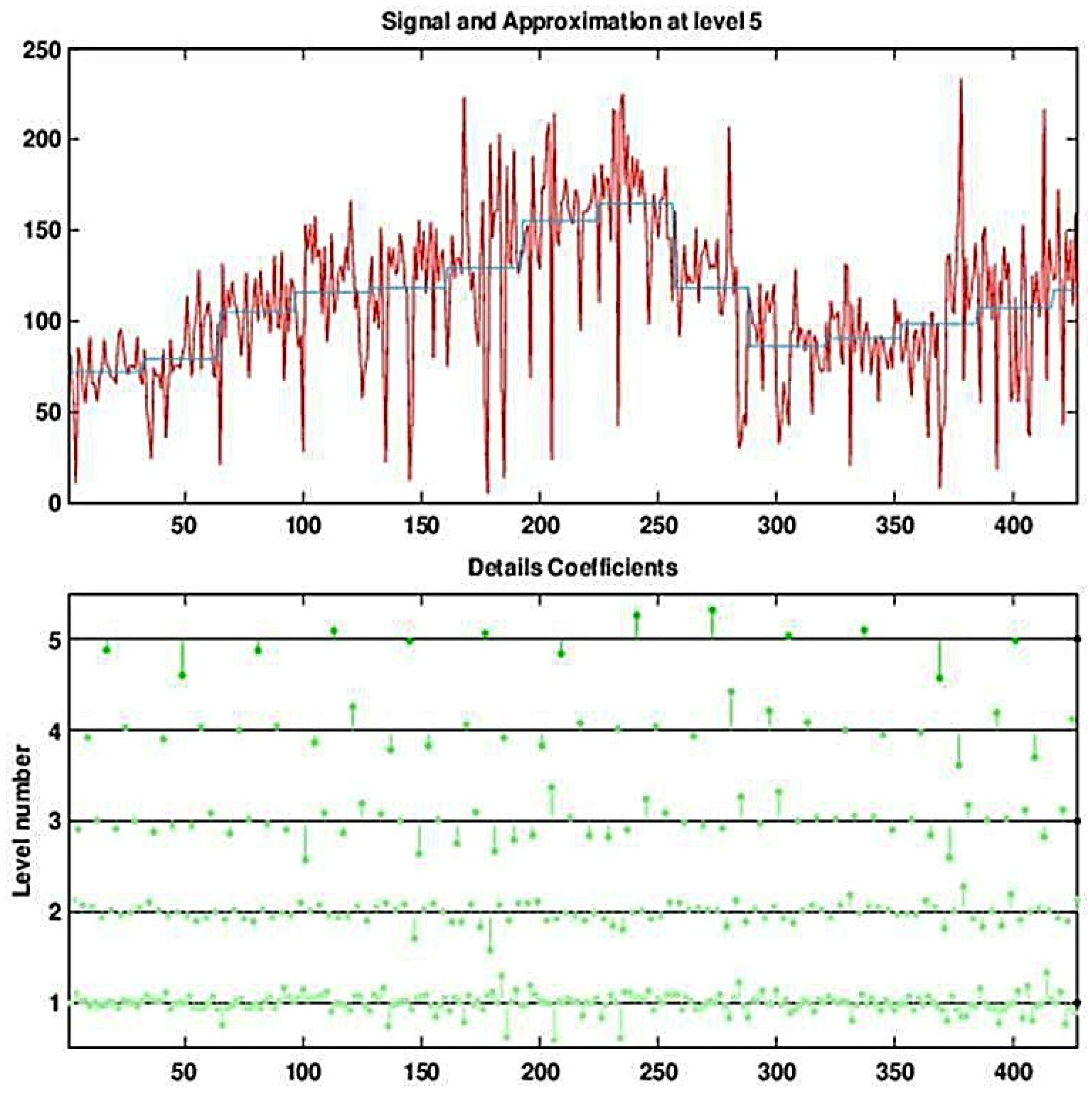 Figure 4 and Figure 5 show the result of a DWT with five levels for the (deseasonalized) daily number of visits to military outpatient clinics dataset (deseasonalization is described further in Section 3). Figure 4 displays the Multiresolution Analysis, which includes the reconstructed coefficients (). Figure 5 shows the set of five detail coefficients () in the bottom panel and the fifth level approximation () overlayed on top of the original series.