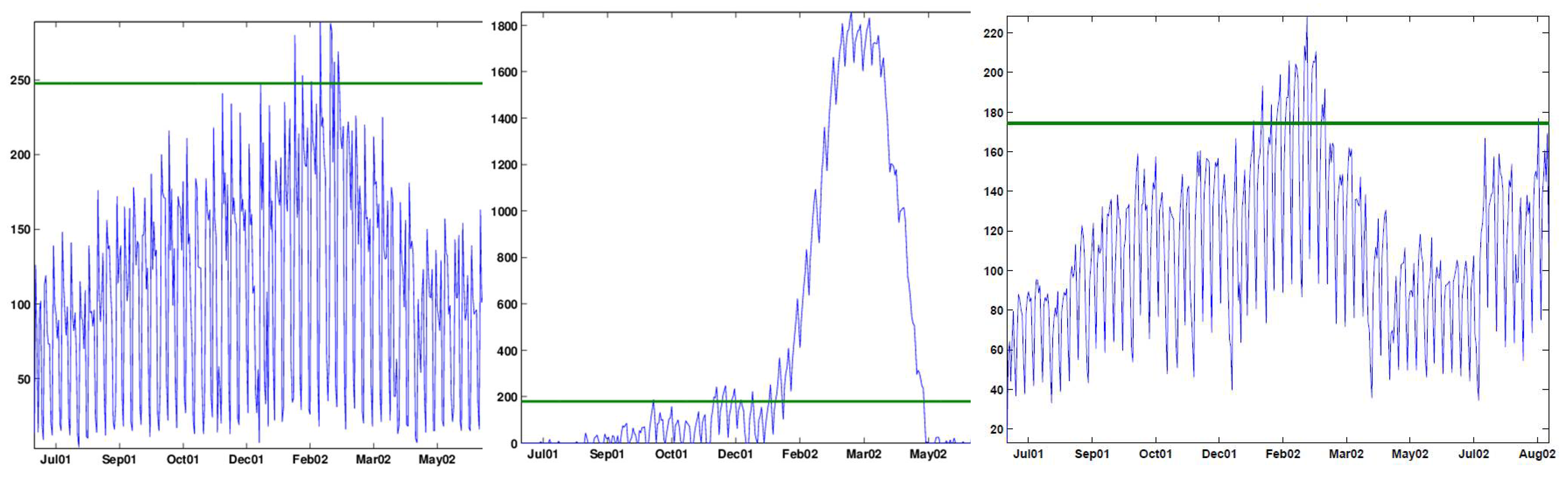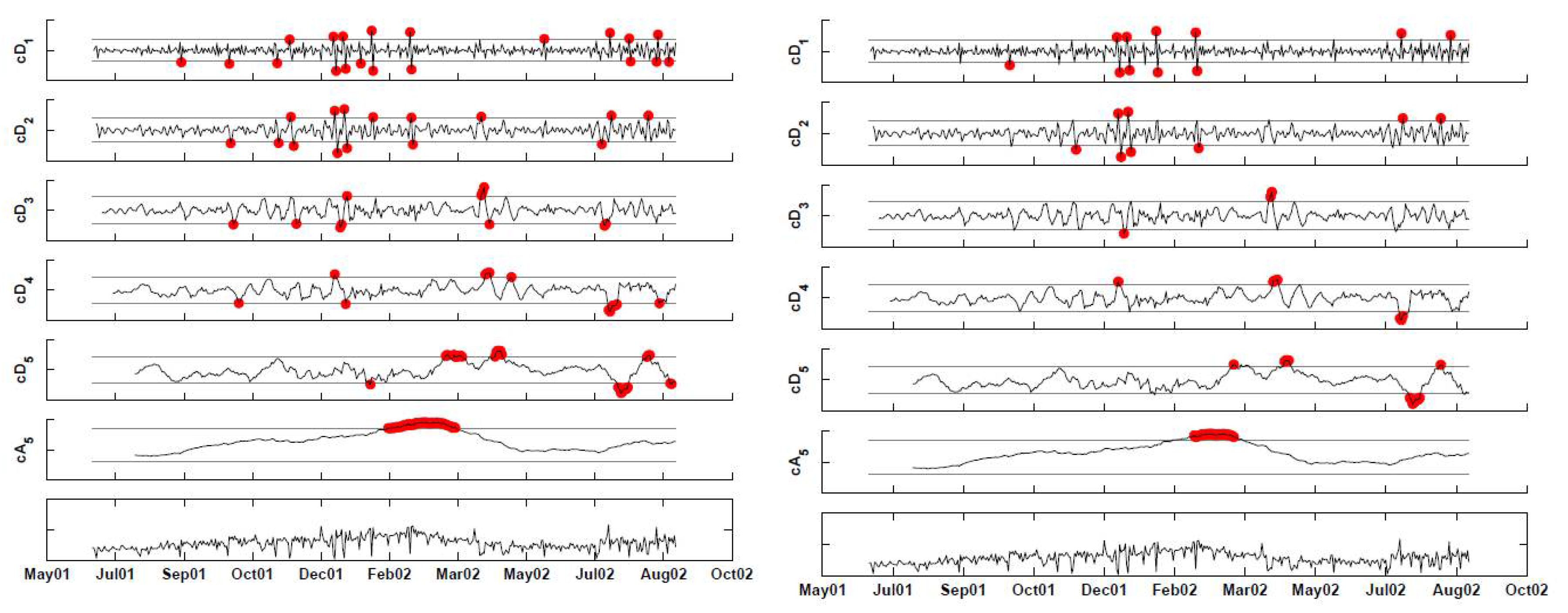 Using wavelets for retrospective monitoring is the easier task of the two. The goal is to find anomalous patterns at any time points within a given time-series. This can be done by constructing thresholds or “control limits” that distinguish between natural variation and anomalous behavior. Wang [20] suggested the use of wavelets for detecting jumps and cusps in a time-series. He shows that if these patterns are sufficiently large, they will manifest themselves as extreme coefficients in the high detail levels. Wang uses Donoho’s universal threshold [21] to determine an extreme coefficient. This threshold is given by , where σ is estimated by the median absolute deviation of the coefficients at the finest level, divided by 0.6745 [20].