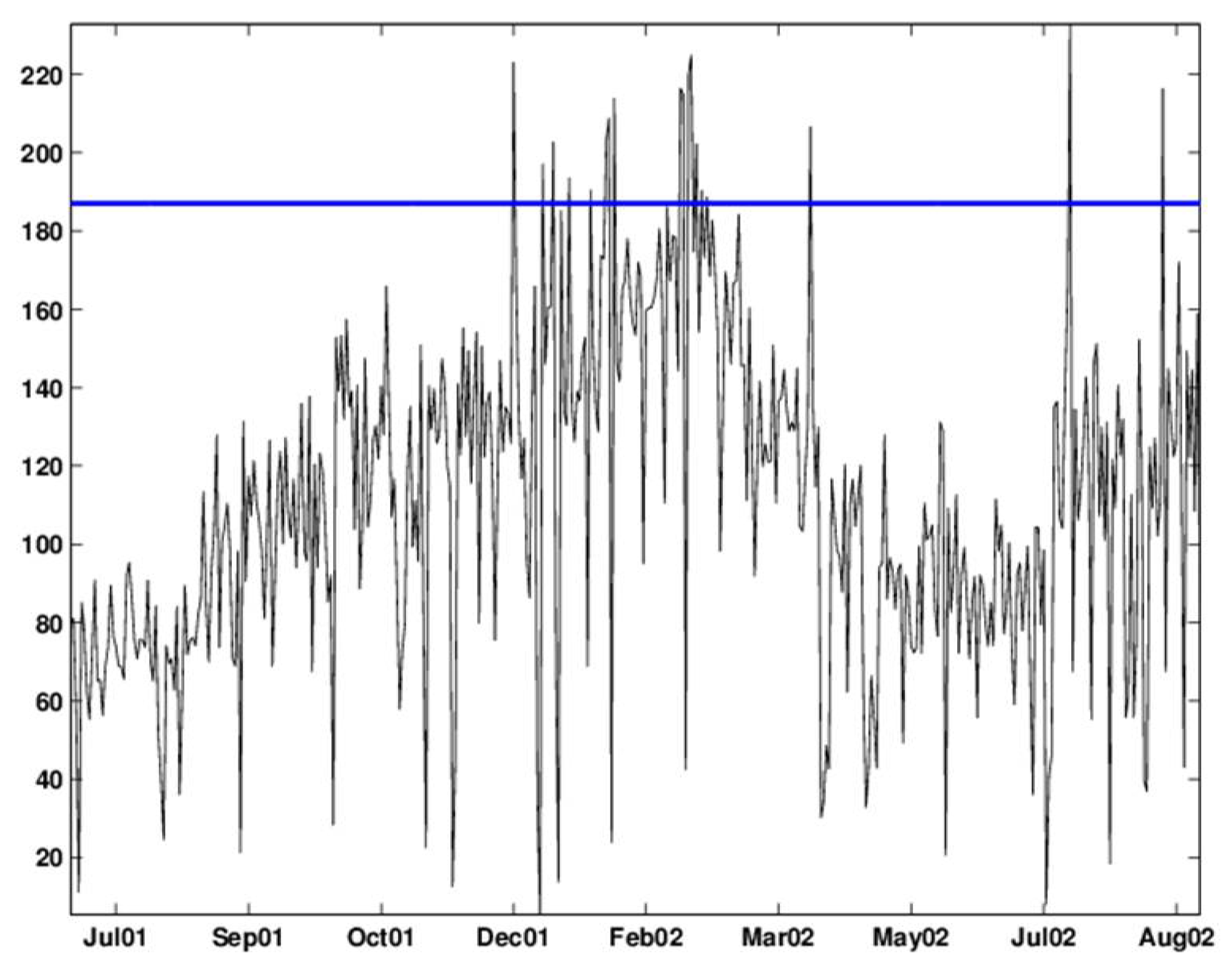 Even after the FDR correction, we get alarms for long periods of time: the first is between January 17 and February 25, 2002 and then, we get three single day alarms on June 22, June 30, and August 13, 2002. These results are not trustworthy, because of the heavy correlation within each scale. We therefore used AR(7) models to forecast the next-day detail coefficients. Using the phase I period, we estimated the scale-specific model coefficients using the first 92 days and the associated standard deviation of the forecast errors from the next 92 days. The estimates are given in Table 1.
