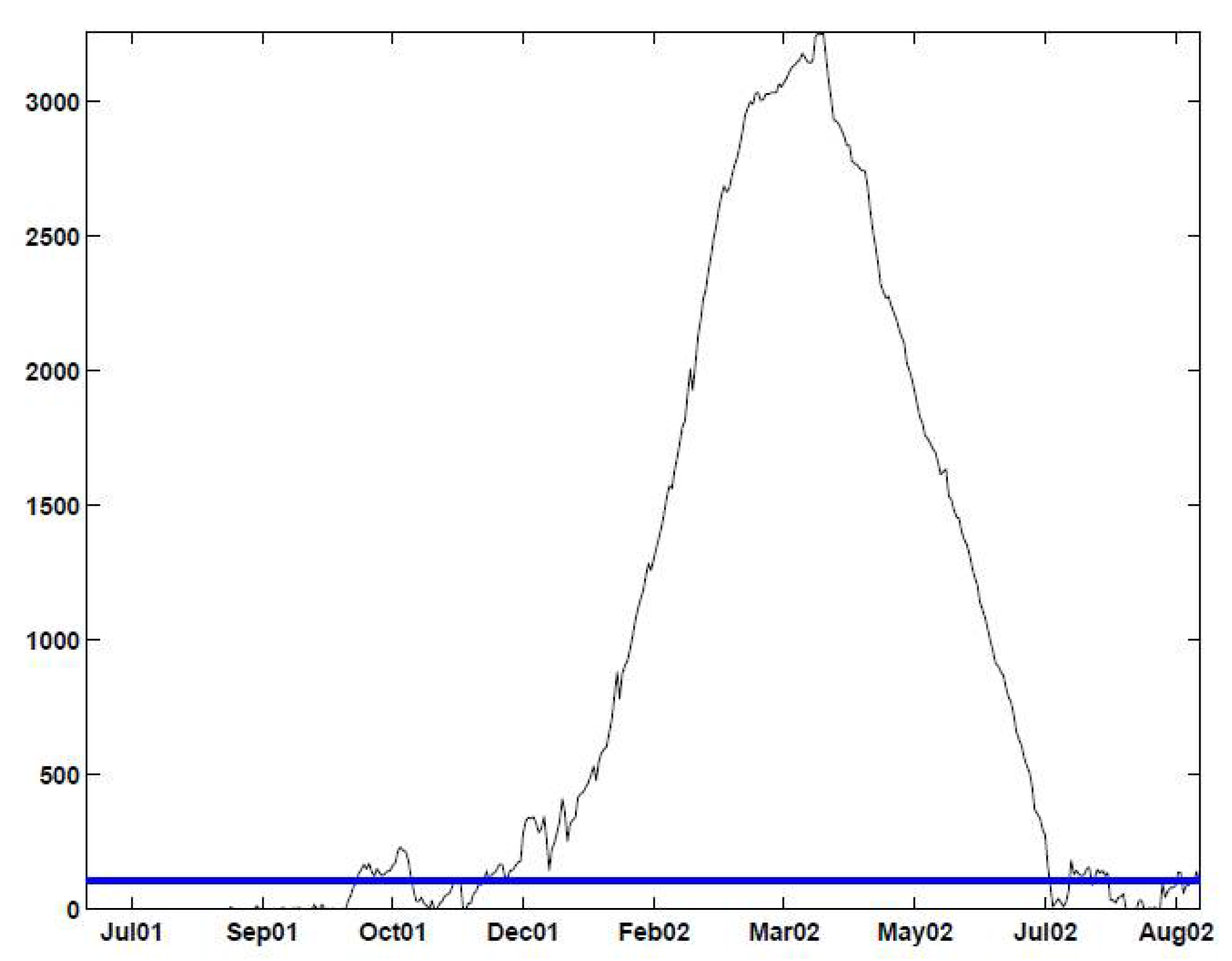 CuSum chart with and applied to the deseasonalized data. The chart signals alarms around five periods: October 13, 2001 to November 2, 2001; November 19–20, 2001, November 30, 2001 to July 4, 2002; July 13–27,2002, and August 23–31, 2002.