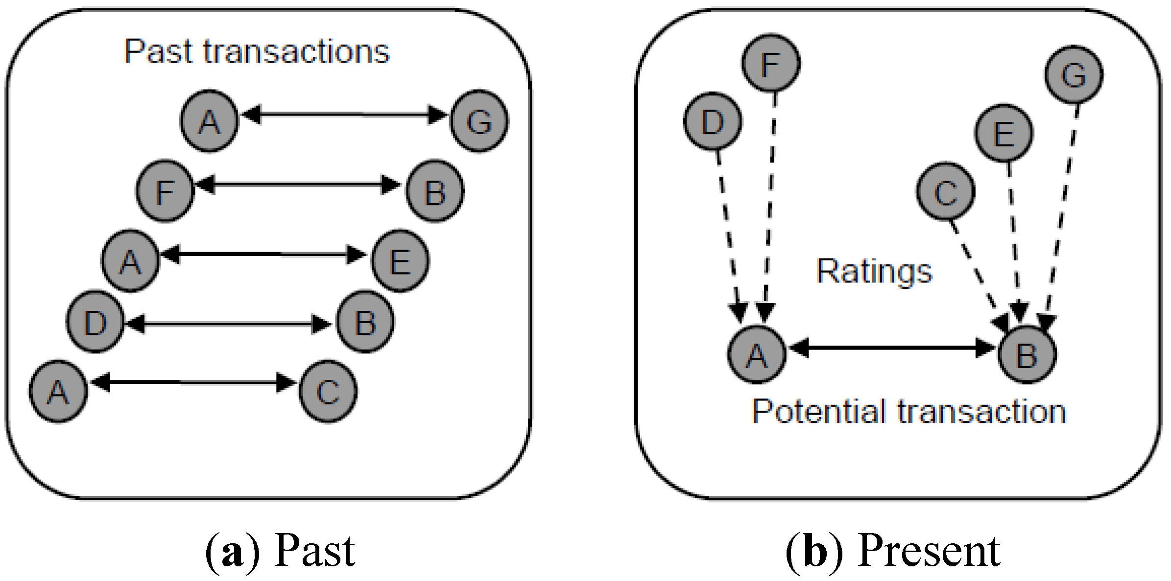Framework for centralized Reputation Systems. “Adapted from [1]”. (a) Past interaction between agents is shown; (b) Present interaction between agents is shown.