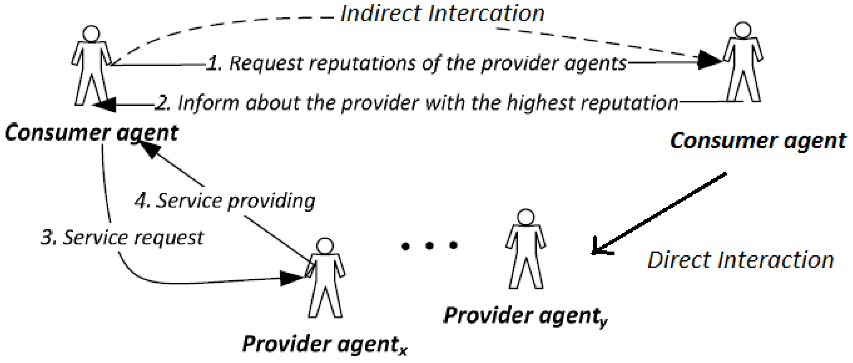 - Sabater, J.; Sierra, C. Regret: Reputation in gregarious societies. In Proceedings of the Fifth International Conference on Autonomous Agents, New York, NY, USA, 2001; pp. 194–195.
