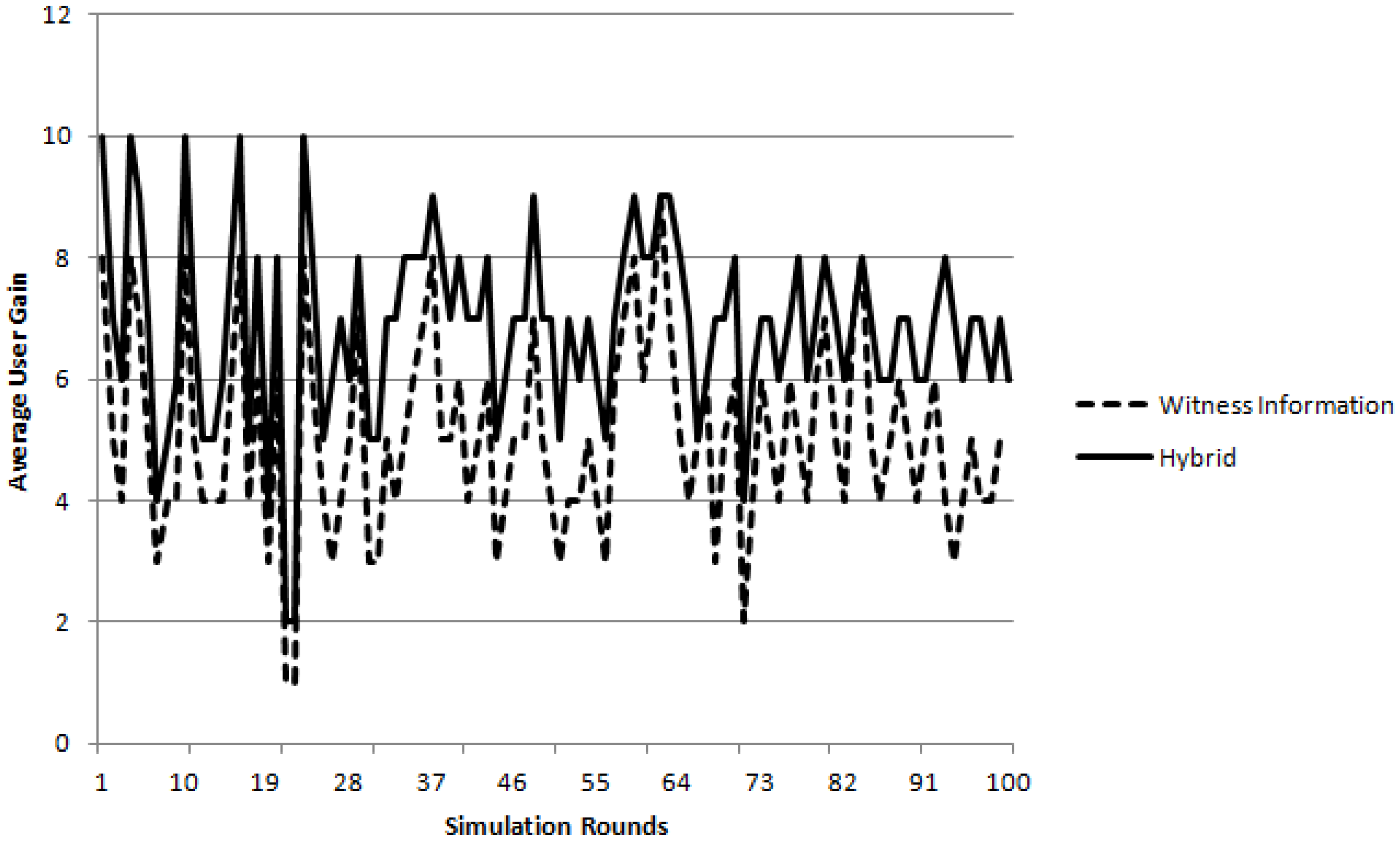 Figure 4 shows the comparison between the witness-hybrid sources of information and Figure 5 shows interaction between the trust-hybrid sources of information. The dashed line represents the experiment results that involve the source as witness information alone. The continuous line represents the hybrid model that uses both the sources of information, which are interaction trust and witness information. The third line, that is the dotted line, involves interaction trust as a source of information only. The Y-axis represents the average UG (the gain that users obtained), and the X-axis represents the round of experiment. Simulations are run in rounds and the round number is used as the time value. The average user gain here signifies that when consumer agents interact with other consumers present in the simulation environment in a hybrid way, then they tend to obtain better goods or services provided by the provider. This means more benefit for consumers, which leads to more gain. As a result, the average gain computed in the end is more in case of hybrid then individual sources of information. All of these approaches are proved to be beneficial to consumers. It shows that all the information sources discussed above can help consumers to select profitable providers to transact. However, as seen in Figure 4, hybrid outperforms the approach that uses witness information only and in Figure 5 hybrid also outperforms when interaction trust is used alone. As we see in both the cases the continues line (which represents the hybrid approach) is above or in a higher position than the dotted line and dashed line. In conclusion, through experiments we prove that hybrid is more helpful for consumers to select profitable providers. Experiment results are shown in figure 4 and figure 5 below.