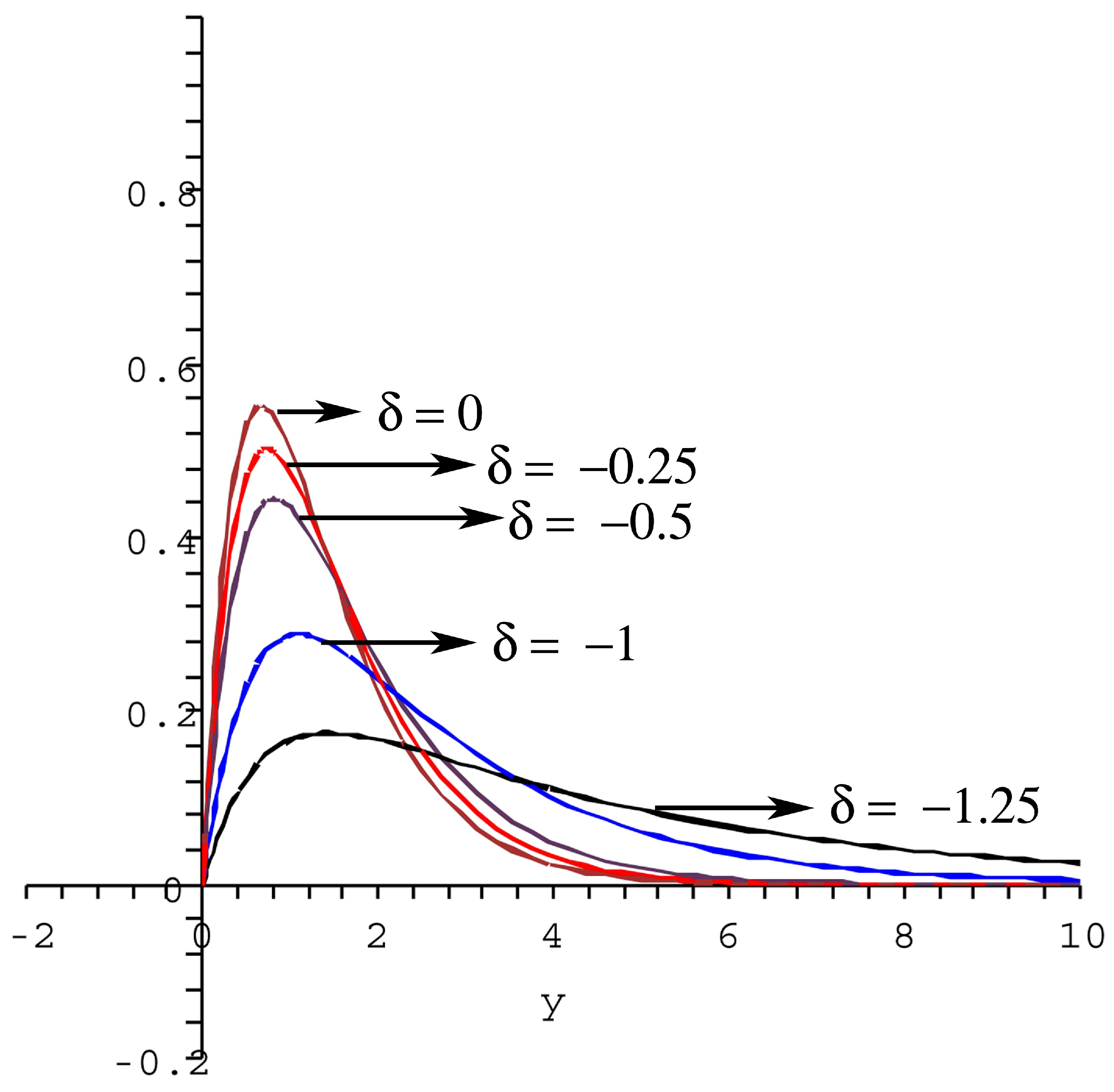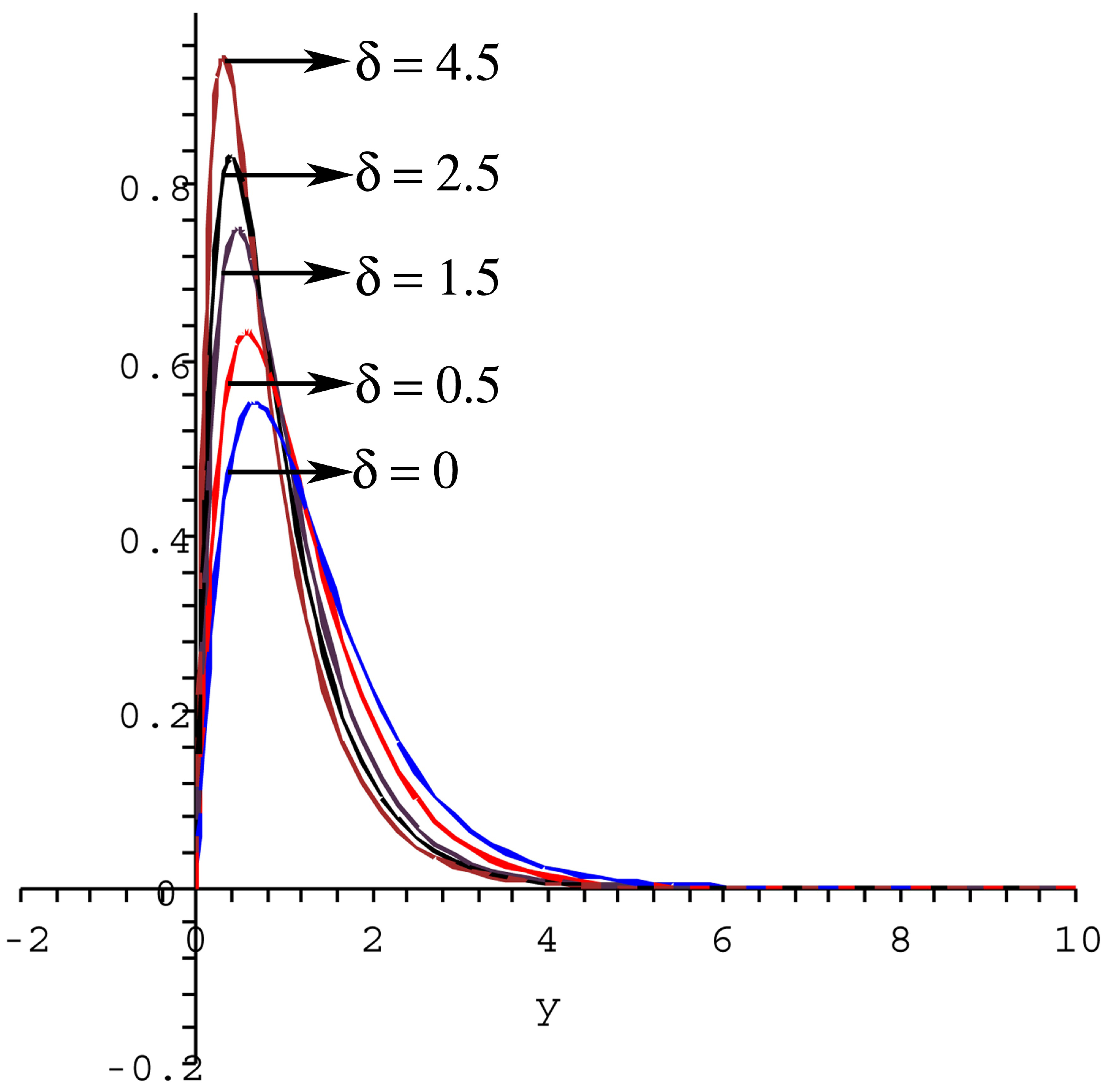 For in Equation (2), we have the exponential density. For and in , we have the chi square density with n degrees of freedom. For in Equation (3), we have the Erlang density. For in Erlang density, we have the exponential density. For fixed values of and for various values of δ, we can look at the graphs that give a suitable interpretation to the model in Equation (2).