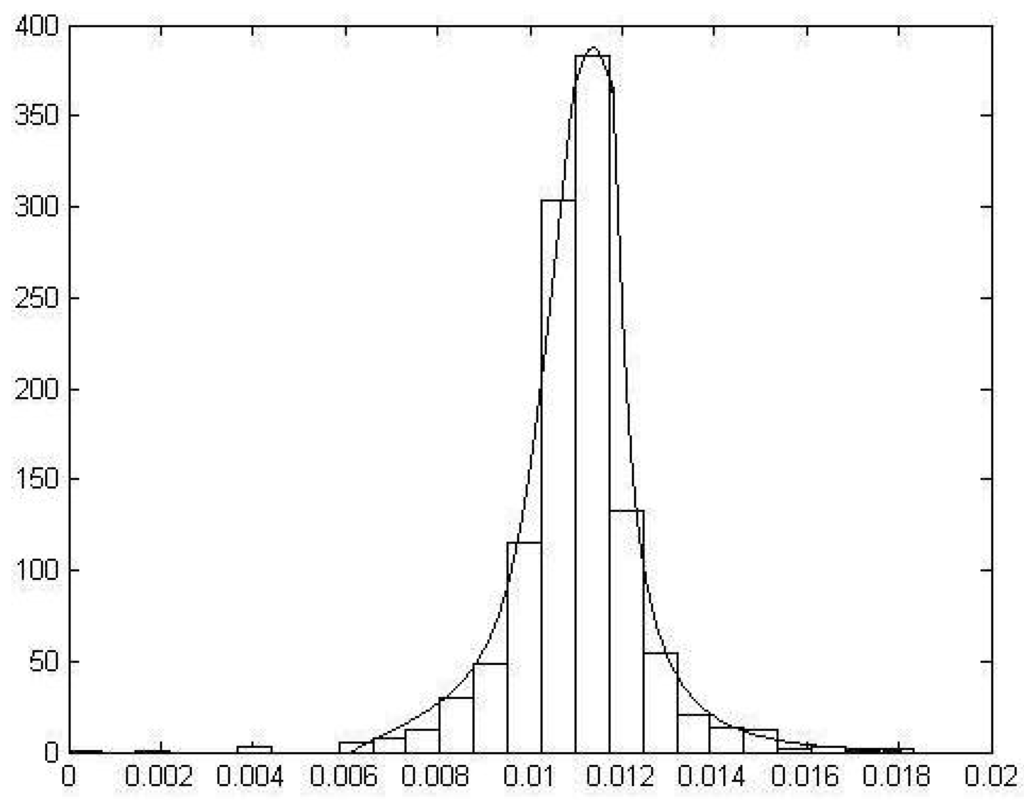 In this section, we present an application of generalized gamma Mittag–Leffler density in modeling currency exchange rates. Here, we considered 1152 observations starting from 2004 to 2008, of U.S. dollar-Indian rupee foreign exchange rates, which is available at www.rbi.org. The log returns of the exchange rates are considered. The following Figure 3 is the graph of the log-transformed data embedded with the generalized gamma Mittag–Leffler density.