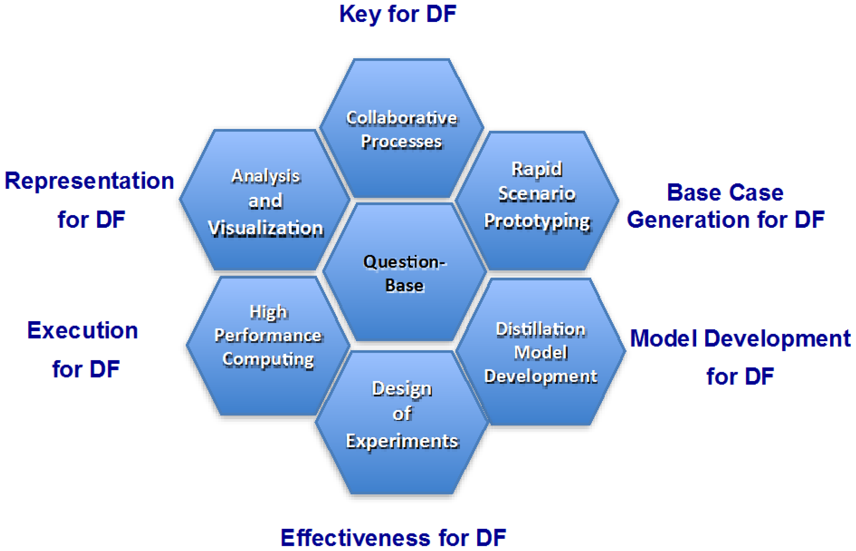 Figure 1 arranges the 6 realms of data farming with the key properties around a question base. It is a sequential process starting with rapid prototyping and ending with analysis and visualization—historically the 6 realms developed in a different order. All activities started out with modeling and high performance computing support with the goal to answer decision-makers’ questions. Feasibility was the initial driver. From the beginning, collaboration was the key—all work on the realms took place in international collaboration contexts and all working groups were multi-disciplinary and, if possible, international. Analysis and visualization efforts were developed to make the enormous amount of result data understandable. As the process matured, Rapid Scenario Prototyping was the starting point of the process. The final realm developed was Design of Experiments. From a complete covering of the parameter space, we went to a statistical covering, making Data Farming more efficient. The combination of the six collaborating realms of the process of Data Farming is unique.