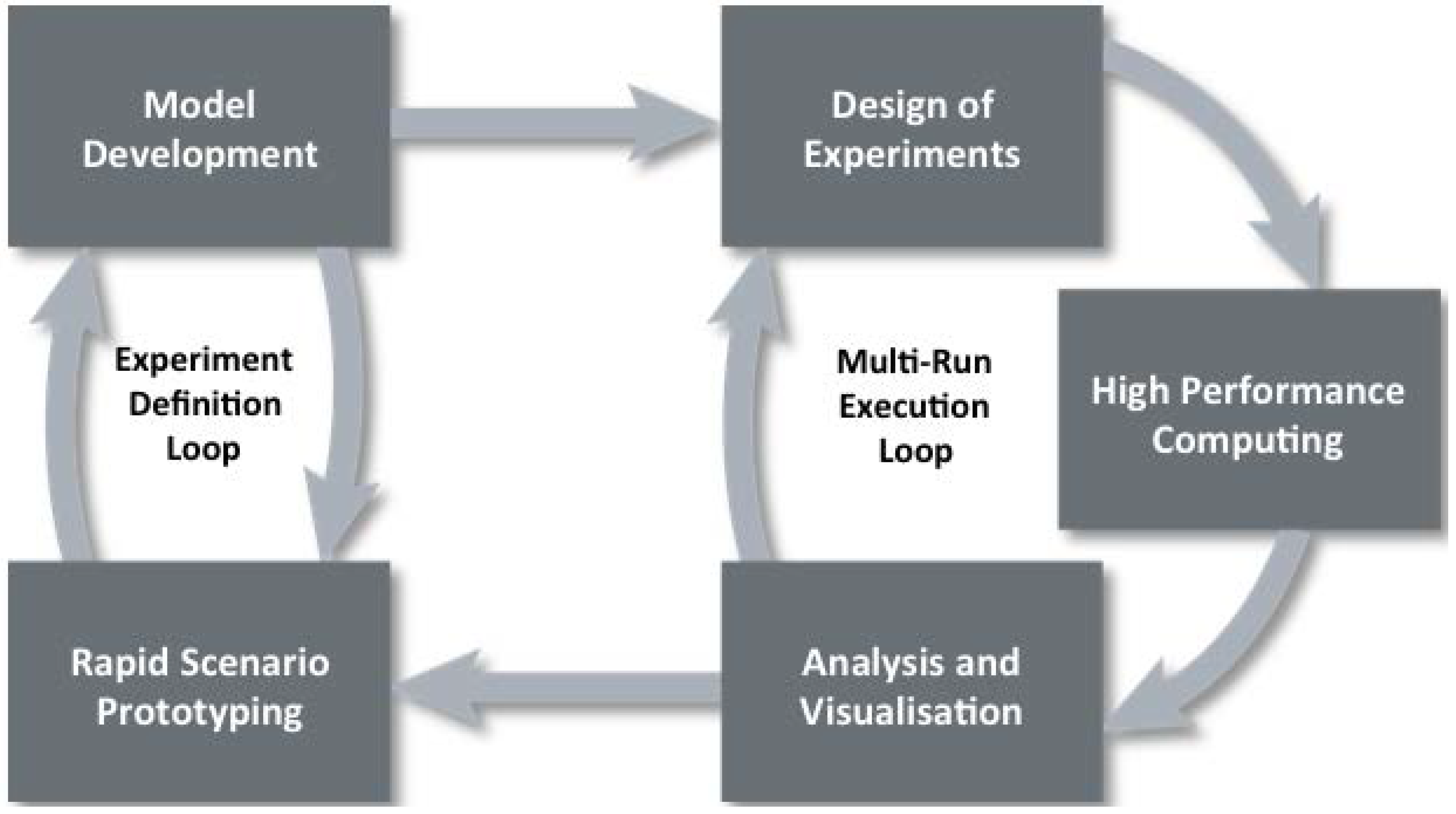 The model development and the rapid prototyping realms together make up the experiment definition loop in Figure 3. As such, they work hand-in-hand with each other and we could choose either realm to begin our detailed description of data farming—with some slight preference for starting with rapid scenario prototyping, because here the model is chosen and specified. Thus, the rapid scenario prototyping process is a good place to start our discussion.