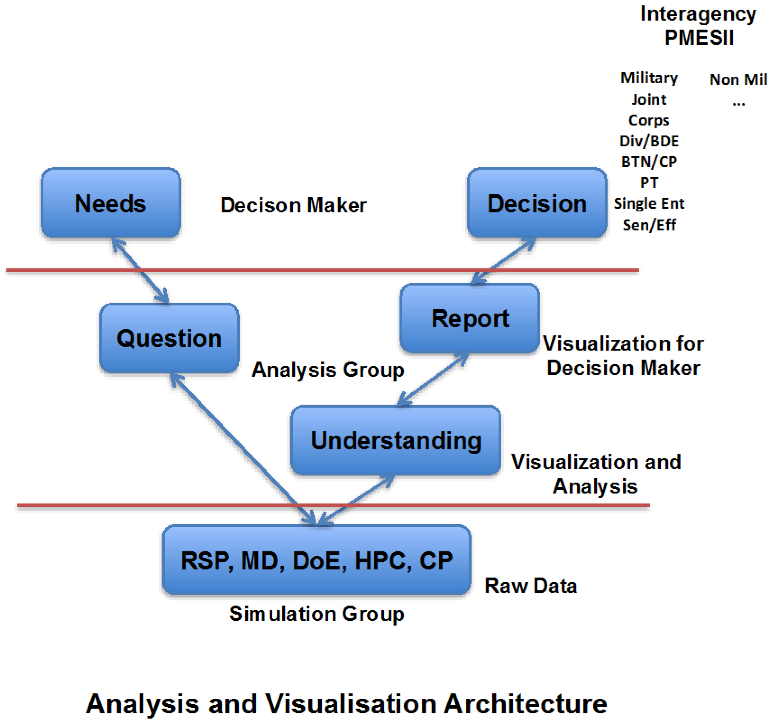 In order to exploit the potentially huge data output from the high performance computing execution of the design of experiments, highly effective analysis techniques must be employed. Statistical analysis and visualization can be used to discern whether data has useful, meaningful value and can aid in the translation of data into information useful in making progress in understanding possible answers to the questions at hand. Figure 6 shows an architecture for the three types of stakeholders: decision-makers, modelers and analysts for any level of decision-making. Every stakeholder has his own needs in analysis and visualization and finally representation of the data output.