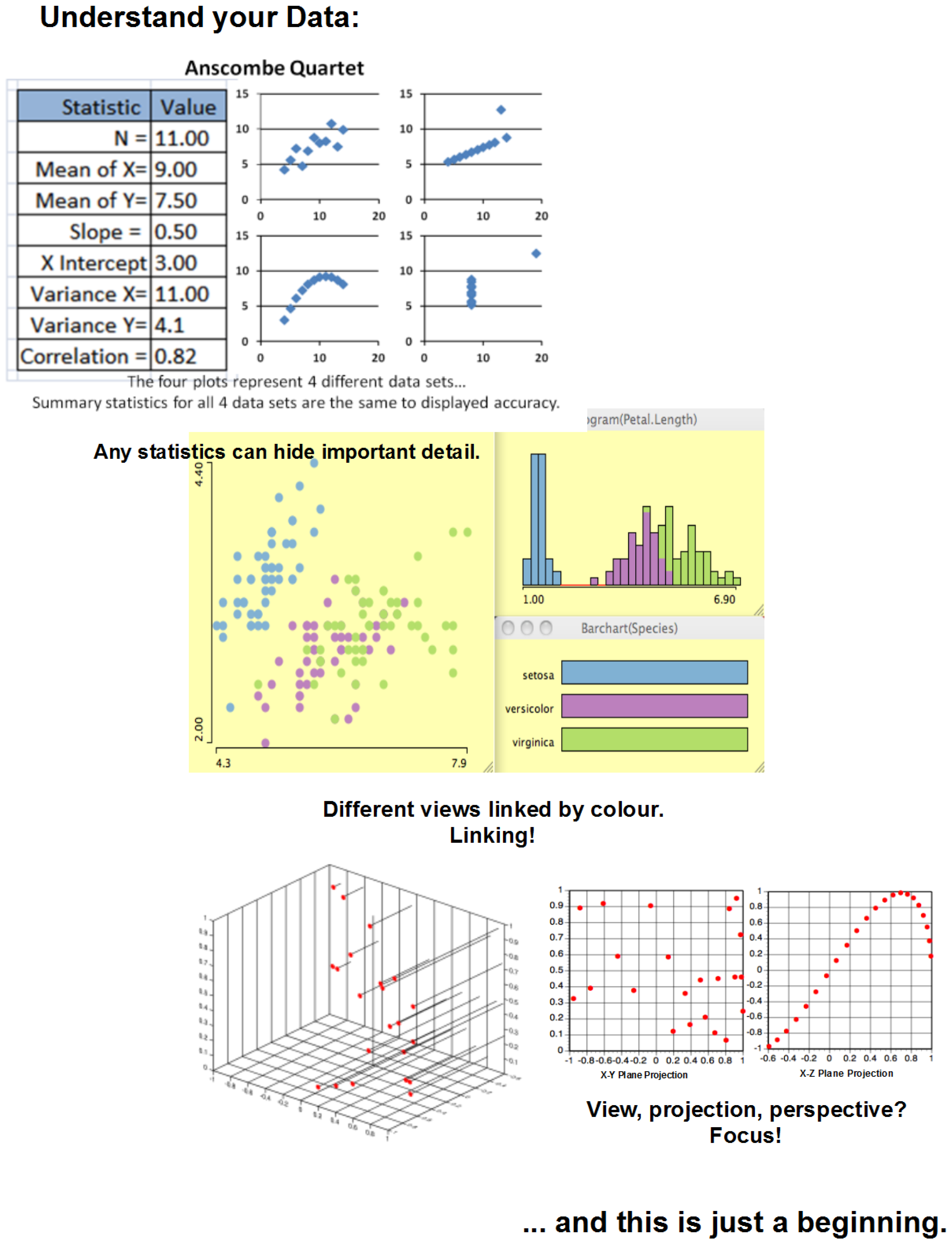 The ability to use multiple techniques gives us the ability to explore, investigate, and answer the questions posed. Every technique has strengths and limitations; therefore, especially for high-dimensional data sets, use of a family of techniques is preferable to the use of a single technique. The key here is the understanding of the data. Figure 7 shows an example of different views on a data set.