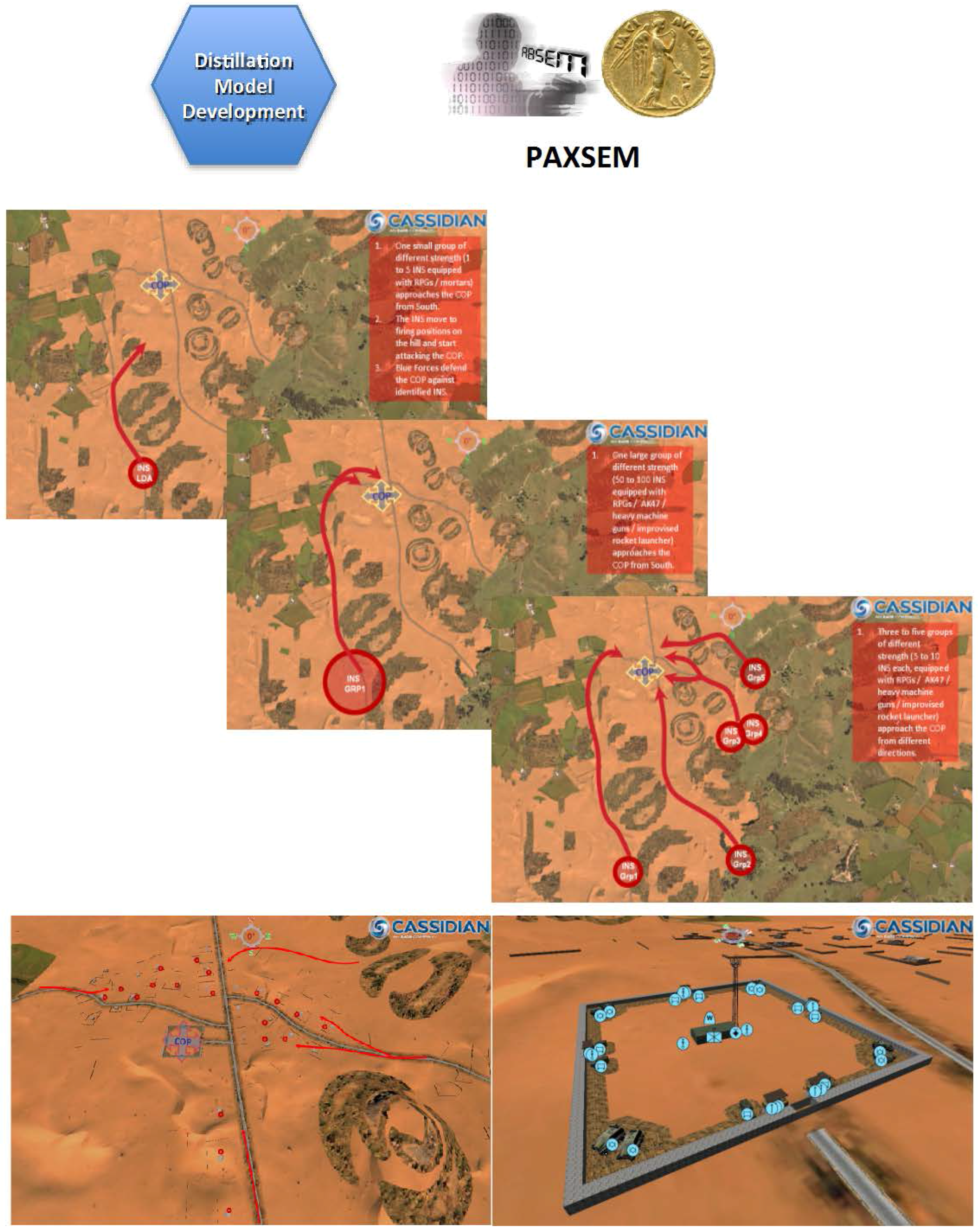 A second case study allowed for the examination of questions in the area of Force Protection. In this case study, the agent-based simulation model PAXSEM, which was developed for the Bundeswehr to support procurement and answering operational questions, was used in conjunction with the data farming process to find a robust configuration of a combat outpost in different kinds of threat scenarios. Figure 8 sketches the modeling part in PAXSEM: Model adaptations and improvements were made to meet the question base. Different scenario settings are depicted. The necessary systems and behaviors were embedded into the model.