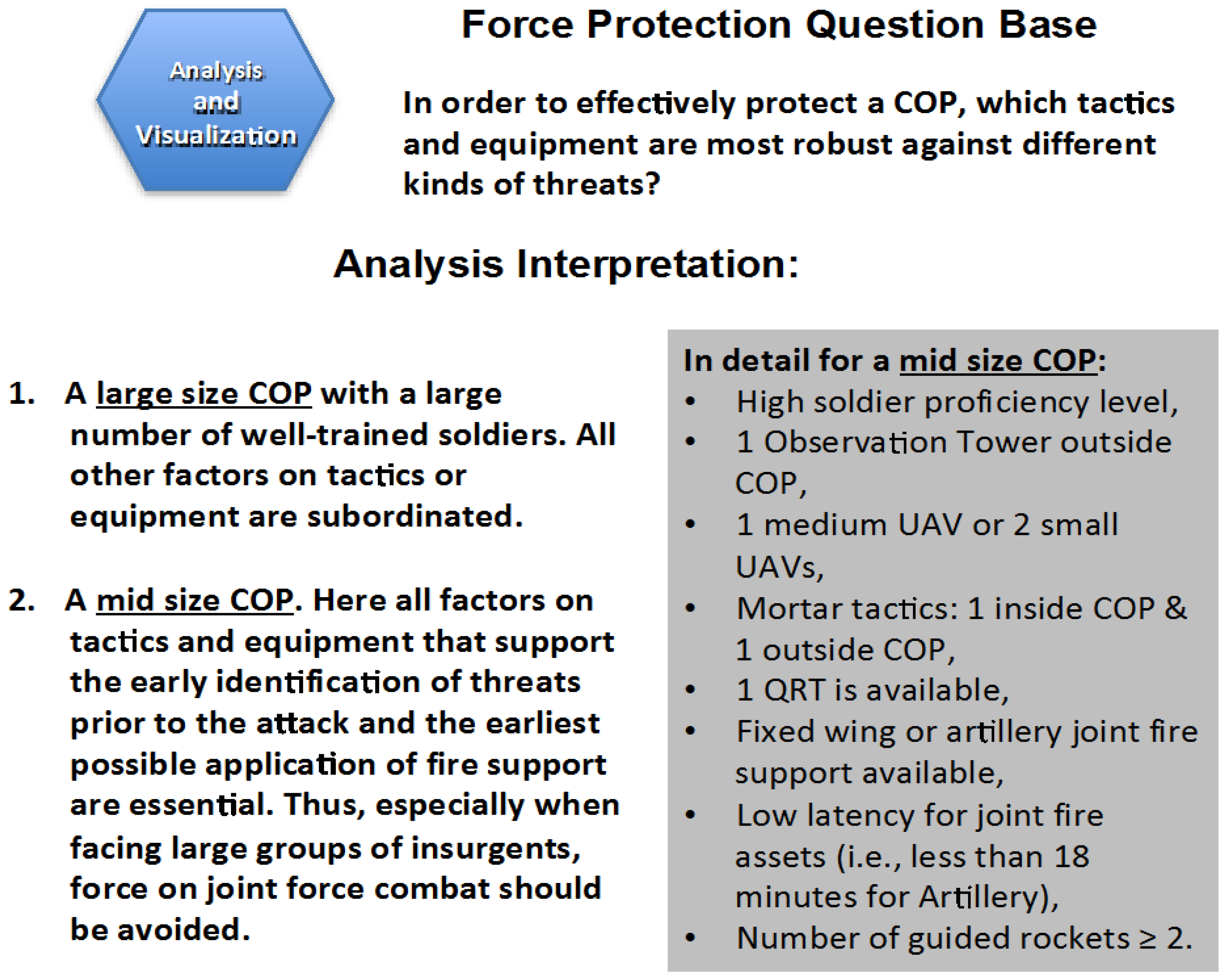 The overall question was “In order to effectively protect a Combat Outpost (COP), which tactics/equipment are most robust against different kinds of threats?” This question was answered via the analysis of the results of a large number of simulated configurations in a tactical scenario that develops over time. The relevant input parameters as well as the necessary measurements of effectiveness were determined and a newly developed experimental design helped to decrease the overall number of possible configurations to a manageable size. Within the given parameter ranges of all possible COP configurations, two different classes of COP configurations were identified to be effectively robust against the different kinds of threats. Figure 9 is an overview of these results.