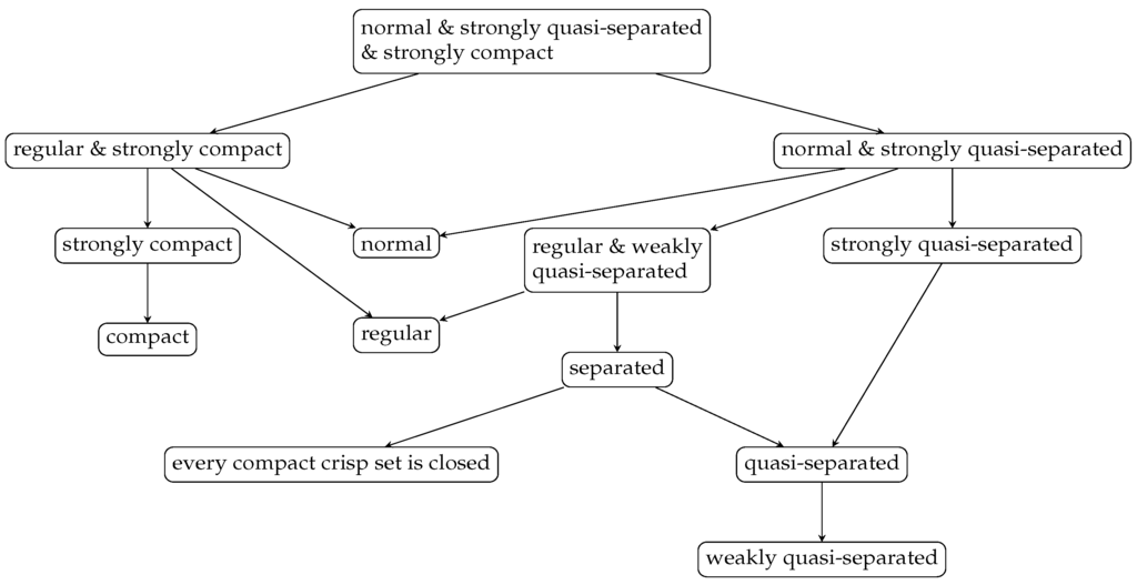 Separation axioms of fuzzy topological spaces have been widely studied. In [] all different separation axioms have been discussed in detail. In [] a characterization of normality in fuzzy topology has been given as well as a full study of the normality of a fuzzy Sierpinski space []. During an attempt to fuzzify upper semi-continuity of multivalued mappings [] some missing links were detected in the class of separated, regular and normal fuzzy topological spaces. In the classical binary case upper semi-continuity is related to the closedness of a mapping. Most of the links between upper semi-continuity and closed multivalued mappings in the crisp case are with respect to separated topological spaces. It was observed that in the fuzzy case separated fuzzy topological spaces are not sufficient to keep these links. To repair these shortcomings the separation axioms were further studied in []. More concretely a Hasse diagram was constructed establishing the relationship between different separation concepts in fuzzy topological spaces. This diagram is shown in Figure 1. Three more equivalences hold as well: