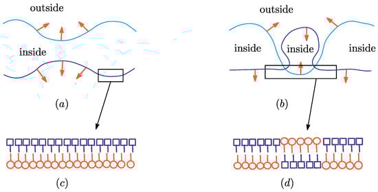 However, such an intersection process is not so easy to implement in the numerical simulations (no numerical simulation is performed in this paper). Apart from this, it is unclear whether or not the implementation of such an intersection process is effective for simulating the membrane inversion. Therefore, we assume that the surface is locally invertible without intersections; an inversion is expected to occur independent of whether the surface is self-intersecting or not. Indeed, real physical membranes are composed of lipid molecules, which have hydrophobic and hydrophilic parts. These lipids form a bilayer structure (Figure 1c). In those real membranes, the bilayer structure is partly inverted just as in Figure 1d via the so-called flip-flop process. Such an inversion process without intersection is not always unphysical because it can be seen in the process of pore formation. The pore formation process is reversible and forms cup-like membranes, where the membranes are not always self-intersecting [33]. The cup-like membranes are stable [34] and expected to play an important role as an intermediate configuration for cell inversion. It should be remarked that the surface orientation is also changeable in the process of cell fission and fusion, where the surface self-intersects, in real physical membranes.