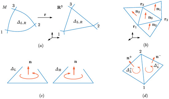 To define a discrete model, we use a piecewise-linearly triangulated surface in [3,4,5]. In this paper, a spherical surface is assumed. Therefore, it is natural to assume that M is also triangulated and of sphere topology. Triangles in M can be smooth in general, and these smooth triangles are mapped to piecewise-linear triangles in by (see Figure 2a,b). We should note that triangle in M has two different orientations. Let denote the triangle that has the left-hand (right-hand) orientation, where corresponds to the left-handed (right-handed) local coordinate system. The symbol is used for non-inverted parts of the surface, while is used for inverted parts shown in Figure 1d. The direction of is defined to be dependent on the orientation of , as mentioned in the previous subsection (see Figure 2c).