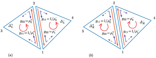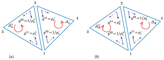 (a) Two neighboring triangles and elements of the inverse metric for and ; and (b) the inverted triangles (inside view).