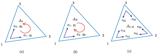 where . The index i of in this represents a triangle (see Figure 2b). Since the coordinate origin can also be assumed at Vertices 2 and 3 on triangle , we have three possible discrete expressions, including those in Equation (5) for and . Thus, we have: