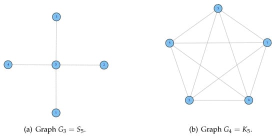Some graph theoretic terminology and notation need to be introduced here [50]. denotes a complete graph in which each pair of vertices is adjacent, is a star graph consisting of one vertex of degree and pendant vertices, and denotes a cycle with n vertices. Now, consider the following Figure 4. In graph-theoretical terms, the (vertex) automorphism group of is transitive, and therefore, the automorphism group of has just one orbit. Thus, . From Figure 4 it is apparent that both graphs are vertically and horizontally symmetric; yet, their index values are different (see below). In terms of the network style, we could also say that is more disordered than . More generally, we could also argue that aesthetics here correlates with simplicity of a network, which becomes obvious in the case of . The graph is regular, and therefore the simplest and most symmetric case possible.