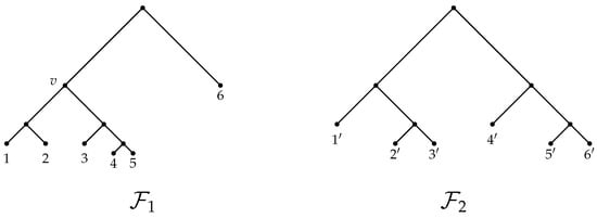 Almost automorphisms of the rooted tree , in which the root has r children and every other vertex has q children, have been studied extensively. In this notation, Neretin’s group of almost automorphisms is . The group has the Higman–Thompson group , see [,], as a dense subgroup and elements of may be represented (non-uniquely) as pairs, , of finite rooted subtrees of , see [] or ([] Section 3) for example. Since the scale is continuous, it therefore suffices, in order to compute the scale on , to compute it for elements represented by such pairs of finite trees. This calculation is intricate and the general case is not described in full detail here. Instead, the ideas will be illustrated by the calculation of for one element x in . Note, however, that this example only displays some of the intricacies arising in the calculation of the scale on .