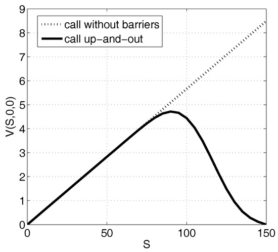 Looking at Example 1, the values of a call option with an up-and-out barrier obtained by SABO and displayed in Figure 1 show that the solution, as expected, assumes lower values than the analogous option without barriers whose closed formula is (12) or that can be computed through the evaluation of the payoff expected value (10). The same behavior is recovered by the two proposed FD methods (FD1 and FD2).
