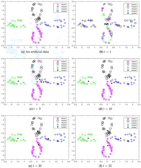 The demonstration figure of the clustering process for artificial data. (a) The original data. (b–e) The clustering figures when the number of iterations 1, 5, 10, 20, respectively. (f) The final clustering result.