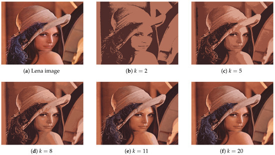 In this subsection, we use the proposed algorithm for image segmentation. As a simple example, the Lena image was used to test the proposed algorithm for image segmentation. Through this example, we wish to show that the proposed algorithm can be applied to image segmentation. Figure 2a is the original Lena image. Figure 2b shows the segmentation images when the number of clusters was 2, and we can see that the quality of the image was greatly reduced. Figure 2c–f shows the segmentation images when the number of clusters was 5, 8, 11 and 20, respectively. We can see that the quality of segmentation image was improved very much with the increase of the clustering number.