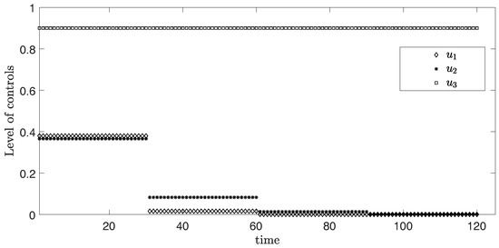 In this scenario, the period is 15 days or approximately two weeks for each time horizon. Figure 3 represents the simulation of three controls over 120 days. From the graph, is at the highest level around 0.6 in the first two weeks and discretely drops to approximately zero within one month. For , it reaches around 0.45 for the first two weeks, then drops to nearly zero after the second month. Differently, the level of control stays at the maximum value 0.9 during the entire time.
