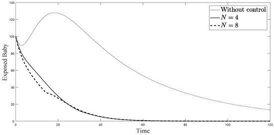 The simulations in Figure 4, Figure 5, Figure 6, Figure 7, Figure 8 and Figure 9 represent the number of exposed babies, infected babies, exposed adults, infected adults, exposed vectors and infected vectors, respectively. In each graph, the dotted line represents the model without control, the solid line represents the control model with Scenario , and the dashed line represents the control model with Scenario . In Figure 4, Figure 5, Figure 6, Figure 7, Figure 8 and Figure 9, the numbers of exposed and infected individuals from the model with controls are less than those of the model without control. This implies that control strategy ceases the serve of the disease. The models from both scenarios yield very close results where is slightly better. Notice in Figure 4, Figure 5, Figure 6 and Figure 7 that the disease spreads heavily during the first month. Later, those patients decrease and become stable after two months, corresponding to the drop in control and after two months. Thus, both and contribute to the control of the disease. The control contributes the most and becomes the top priority in the strategy.