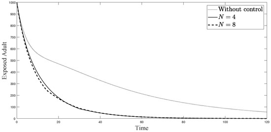 Simulation results of exposed adults from: (i) the model without controls; (ii) the control model with ; and (iii) the control model with .