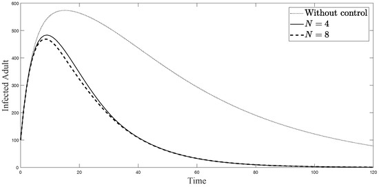Simulation results of symptomatically infected adults from: (i) the model without controls; (ii) the control model with ; and (iii) the control model with .