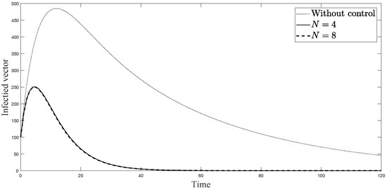 Simulation results of infected vectors from: (i) the model without controls; (ii) the control model with ; and (iii) the control model with .