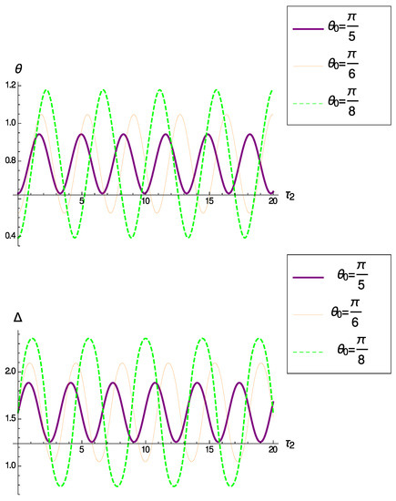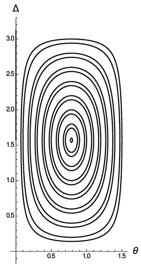 Corollary 1. For any sufficiently large and sufficiently small, there is , with and such that (8) has a T-periodic solution near (17) for small and either , , or , , . Proof. The bifurcation equation has the form (see [