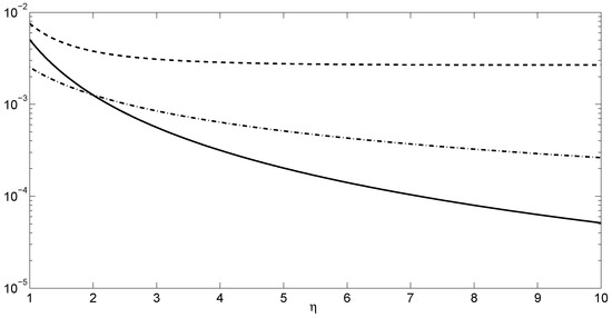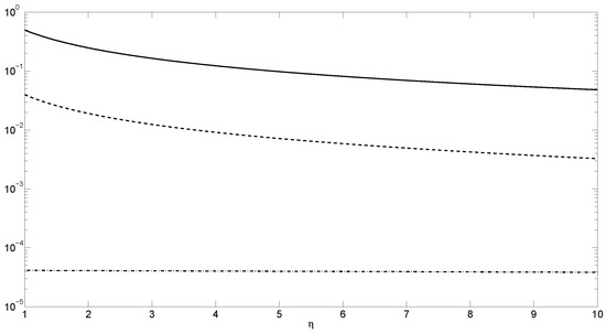 Graphs of (continuous line), (dashed line) and (dashed-dotted line, the lowest one) over , for the Adams–Moulton method applied to Problem (2), with , , .