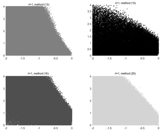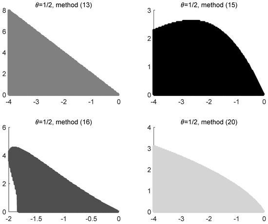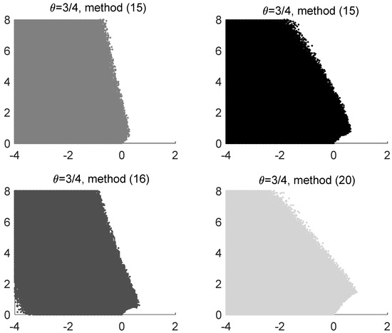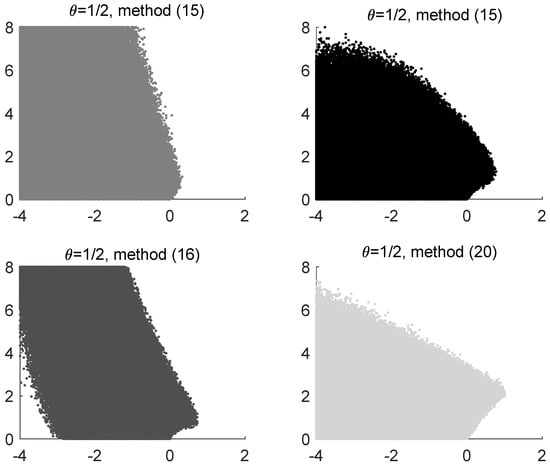 Figure 3 and Figure 4, respectively, show the regions of mean-square stability of the methods defined by Equations (13), (15), (16) and (21) with respect to the basic test Equation (11) for and . Such methods, introduced in [15], can achieve unbounded stability regions in correspondence with the some values of the parameter . As visible from Figure 5, some methods have unbounded regions when . Regions of asymptotic stability are depicted in Figure 6 and Figure 7, respectively, for and . We observe that the regions of asymptotic stability are depicted by computing, for each point in the rectangle , the value of the expectation contained in the left-hand side of the inequality (20) and checking if it is a negative number. Such expectation has been computed over 500 paths.