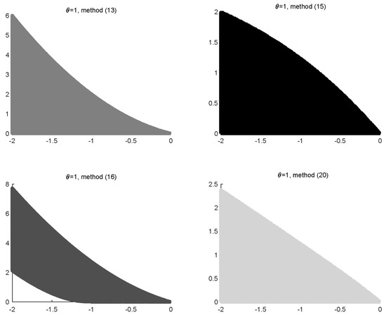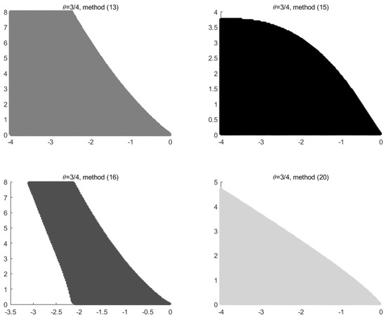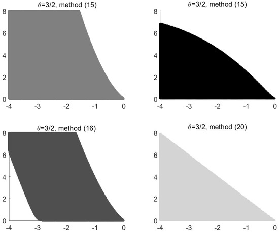 Asymptotic stability regions in the ()-plane with respect to the basic test Equation (11), case .