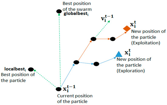 Kennedy and Eberhart [25] introduced a bio-inspired algorithm based on the behavior of a swarm of particles “flying” (moving around) through a multidimensional space search, and the potential solutions to the problem are represented as particles [26]. The dynamics of the algorithm are performed by adjusting the position of each particle based on the experience acquired for each particle and its neighbors [27,28]. The search in PSO is defined by the equations to update the position (Equation (1)) and velocity (Equation (2)) of each particle, respectively:
