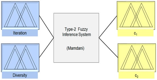 Based on the literature [12,66,67], the inputs selected for the IT2FIS are the diversity of the swarm and the percentage of iterations. Also, in [68], a problem of online adaptation of radial basis function (RBF) neural networks is presented. The authors present a new adaptive training, which is able to modify both the structure of the network (the number of nodes in the hidden layer) and the output weights.