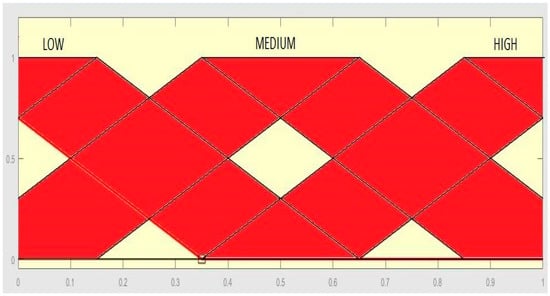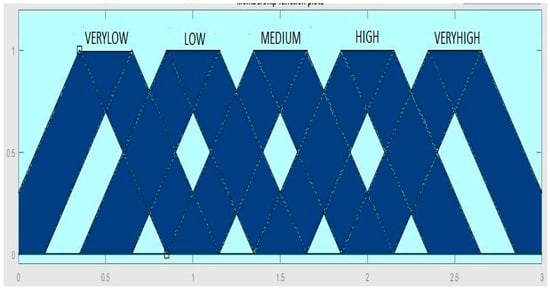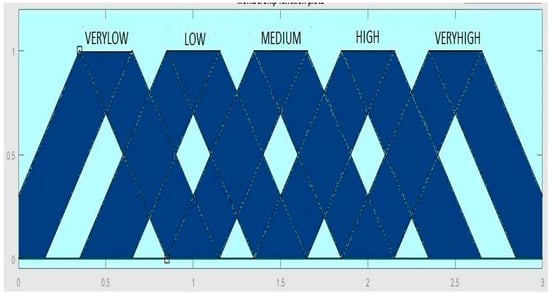 The membership functions for the outputs, and , are presented in Figure 7 and Figure 8, respectively. The values for the two outputs are in the range from 0 to 3.