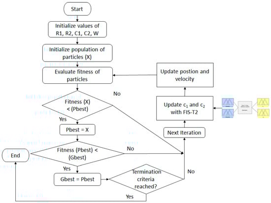 The adaptation of parameters is performed with a Type-2 fuzzy inference system (T2-FIS) to adjust the and parameters for the particle swarm optimization. This adaptation is based on the work of Olivas et al. [12], who used interval type-2 fuzzy logic to improve the convergence and diversity of PSO to optimize the minimum for several mathematical functions. In this work, control of the and parameters is performed using fuzzy rules to achieve a good dynamic adaptation [13,14].The use of type-2 fuzzy logic gives a better performance in our work and this is justified by recent research from Wu and Tan [15] and Sepulveda et al. [16], who demonstrated that interval type-2 fuzzy systems perform better than type-1 fuzzy systems.