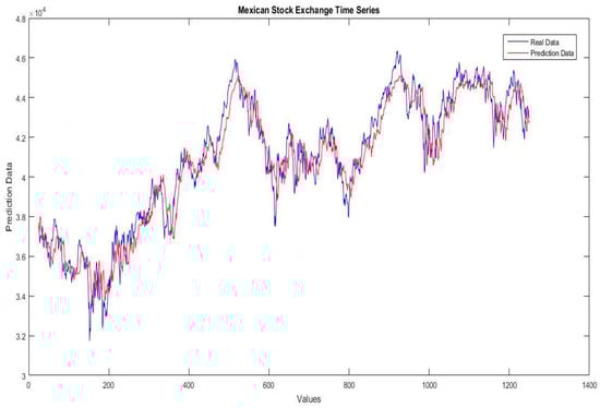 Illustration of the real data against the prediction data of the Mexican stock exchange time series for the fuzzy neural network using Frank optimized with dynamic PSO.