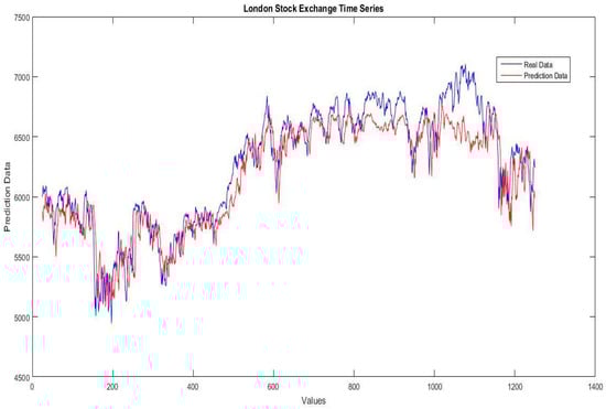 Illustration of the real data against the prediction data of the London stock exchange time series for the fuzzy neural network using Hamacher without optimization.