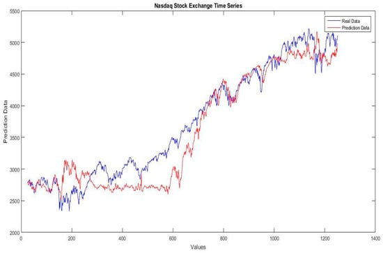 Illustration of the real data against the prediction data of theNasdaq stock exchange time series for the fuzzy neural network using Hamacher optimized with dynamic PSO.